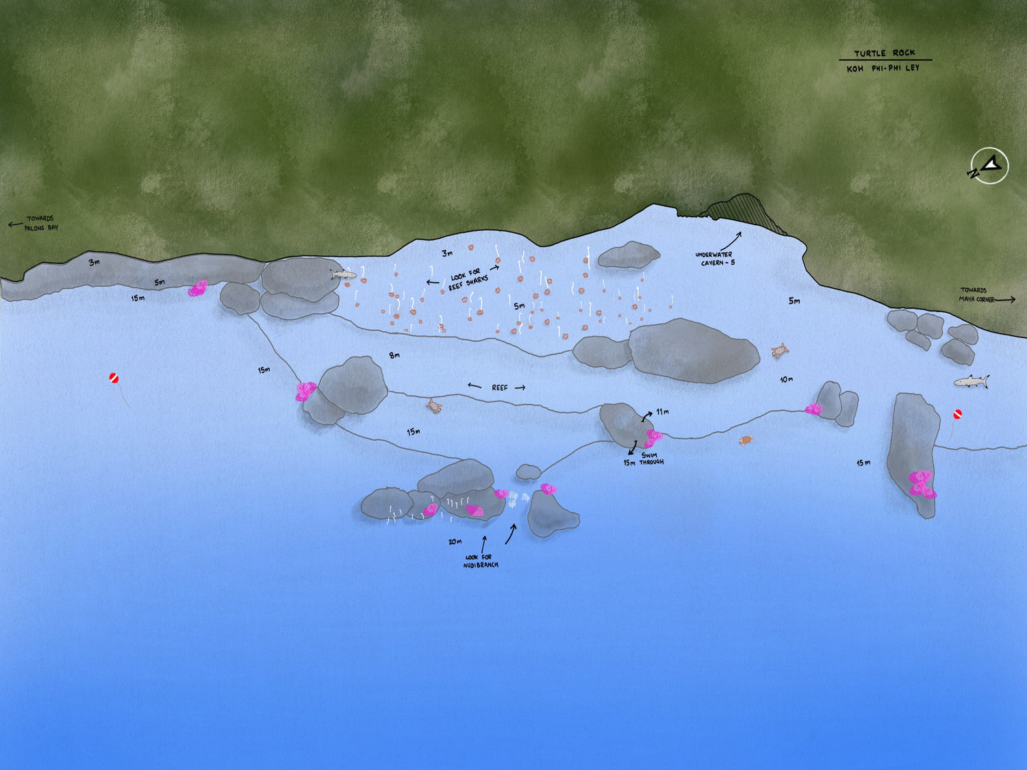 Turtle Rock on the western side of Phi Phi Leh, boasts an interesting topography. Rock formations extend from 18m all the way upto 6m. Underwater canyons and multiple swim throughs clubbed with a shallow ledge at just 6m make it an all round dive site.