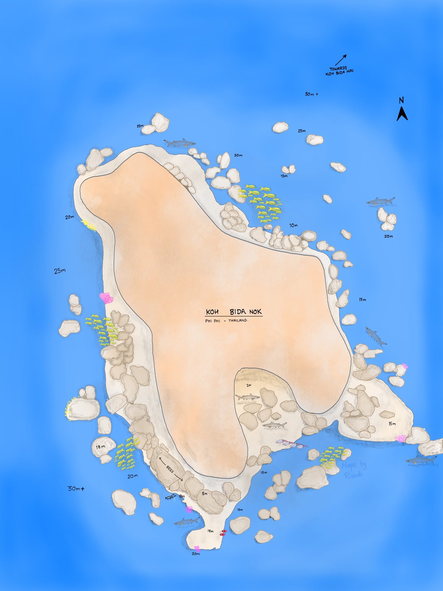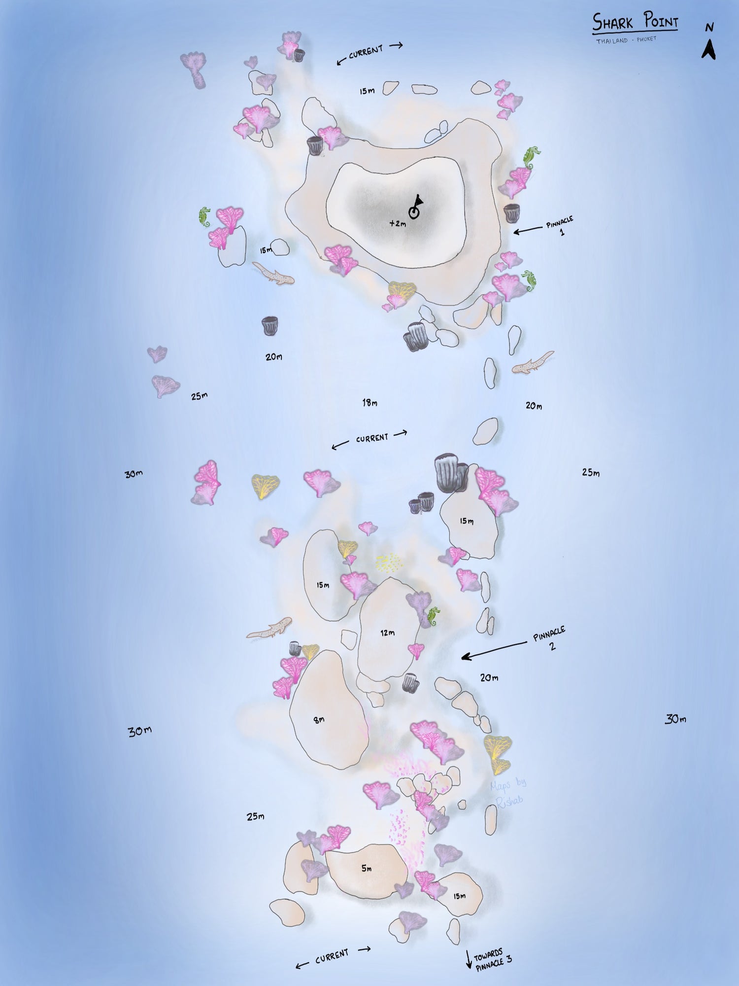 The small limestone island stretches vertically out from the sea and is around 30 meters deep that creating a wall all around. The western side is a mildly sloping hard coral reef that stretches from 12 to 20 meters with plenty of colorful sea life adorning its underwater cliffs.